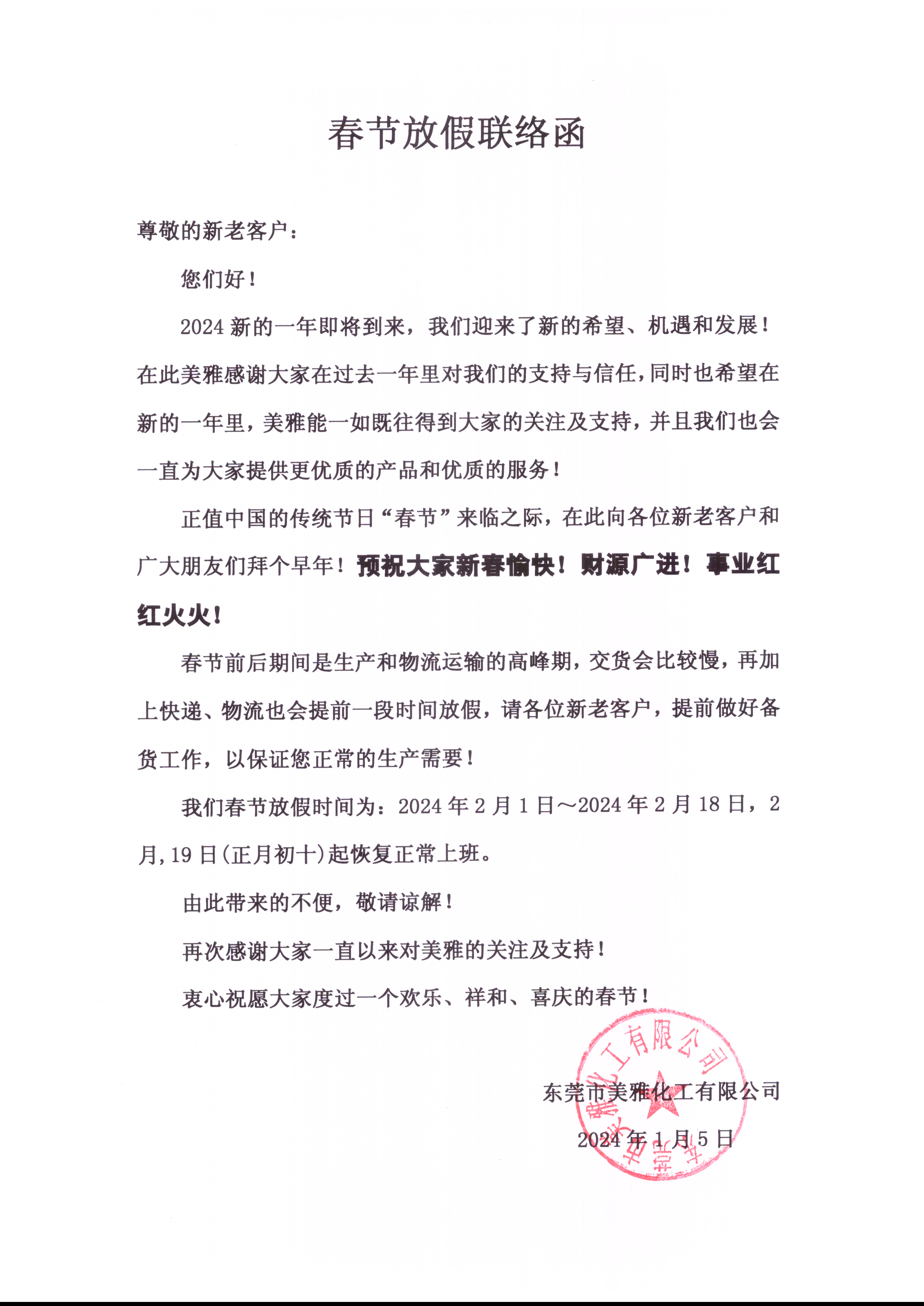 2024年春節放假通知 尊敬的新老客戶: 您們好! 2024新的一年即將到來,我們迎來了新的希望、機遇和發展!在此美雅感謝大家在過去一年里對我們的支持與信任,同時也希望在新的一年里,美雅能一如既往得到大家的關注及支持,并且我們也會一直為大家提供更優質的產品和優質的服務! 正值中國的傳統節日“春節”來臨之際,在此向各位新老客戶和廣大朋友們拜個早年! 預祝大家新春愉快!財源廣進!事業紅紅火火! 春節前后期間是生產和物流運輸的高峰期,交貨會比較慢,再加上快遞、物流也會提前一段時間放假,請各位新老客戶,提前做好備貨工作,以保證您正常的生產需要! 我們春節放假時間為:2024年2月1日~2024年2月18日(共18天),2月19 日(正月初十)起恢復正常上班。 由此帶來的不便,敬請諒解! 再次感謝大家一直以來對美雅的關注及支持! 衷心祝愿大家度過一個歡樂、祥和、喜慶的春節! |